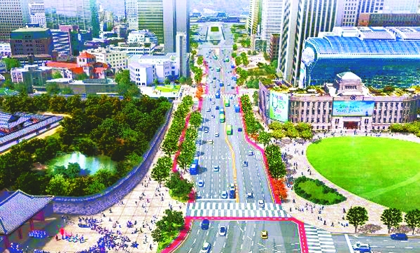 서울시와 서울지방경찰청은 세종대로 1.5㎞ 차로를 재편하는 ‘세종대로 사람숲길’(상상도 참조) 공사를 시작한다고 20일 밝혔다. 광화문광장 맞닿은 세종대로 사거리에서 서울역 사거리 사이 세종대로 9~12차로를 7~9차로로 줄이고, 줄인 자리를 보행로와 자전거도로로 만든다. 가로수길도 조성한다.