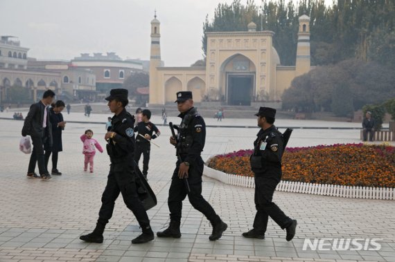 【카슈가르=AP/뉴시스】 2017년 11월4일 중국 신장위구르 카슈가르의 모스크(이슬람사원) 앞을 지나는 위구르 보안 순찰대들의 모습.