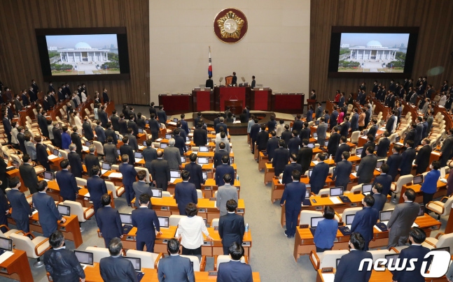 박병석 국회의장과 의원들이 지난 16일 오후 서울 여의도 국회에서 열린 제21대국회 개원식에서 국민의례를 하고 있다. © News1 박세연 기자